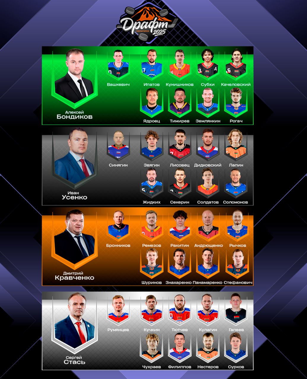 Сергей Стась в свою команду выбрал Германа Нестерова и Арсения Чухраева. Остальные игроки команды: Илья Румянцев («Юность», 4-й пик), Станислав Кучкин («Юность», 5-й пик), Даниил Тютчев («Юность», 12-й пик), Александр Кулагин («Юность», 13-й пик), Данила Гапеев («Авиатор», 20-й пик), Владислав Филиппов («Славутич», 28-й пик), Владислав Сурков («Динамо-Молодечно», 36-й пик).